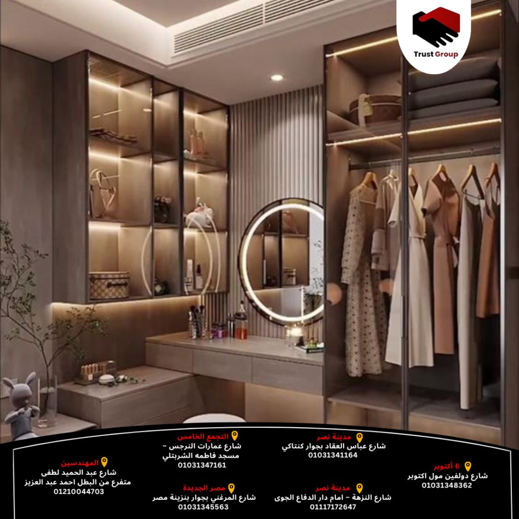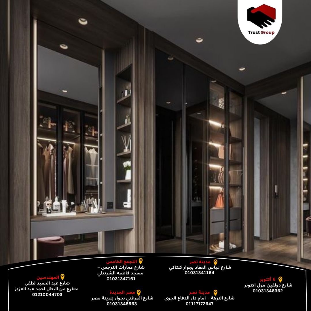 شركة تراست جروب للمطابخ والدريسنج روم فرع مدينة نصر : 2 عمارات السعودية – شارع النزهة – امام دار الدفاع الجوى التليفونات : 26901129 – 01117172647 فرع المهندسين : 23 شارع عبد الحميد لطفى – متفرع من البطل احمد عبد العزيز – امام بنك CIB التليفونات : 33368938 – 01210044703 فرع مدينة نصر: شارع عباس العقاد بجوار كنتاكي التليفون : 01031341164 فرع مصر الجديدة : شارع المرغني بجوار بنزينة مصر التليفون : 01031345563 فرع اكتوبر: دولفين مول اكتوبر التليفون : 01031348362 فرع التجمع: عمارات النرجس – مسجد فاطمه الشربتلي التليفون : 01031347161